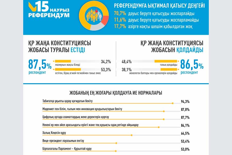 Жаңа Конституция жобасын қолдау деңгейі («Бұқаралық ақпарат құралдарында жаңа Конституция жобасы жарияланды. Сіз осы жобаны қолдайсыз ба?») айтарлықтай жоғары. Сауалнамаға қатысқандардың 86,5%-ы жарияланған жобаны қолдайды: 48,4%-ы ұсынылған өзгерістерді толықтай құптайды, ал 38,1%-ы жекелеген баптары мен ережелерін мақұлдайды. Сонымен бірге құжат мәтінімен жақсы таныс респонденттер арасында қолдау деңгейі ақпараттану деңгейі төмен топтармен салыстырғанда едәуір жоғары екені байқалады.