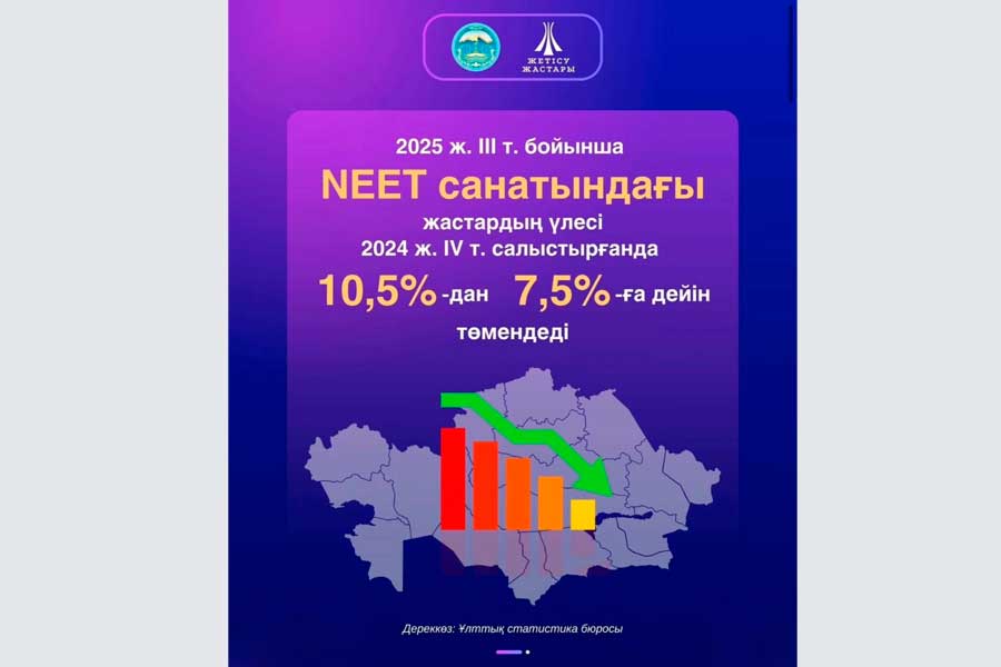Орталықтың жүйелі жұмысы мен серіктестік аясында өткізілген іс-шаралардың нәтижесінде 2025 жылдың үшінші тоқсанында Жетісу облысында NEET-жастар үлесі 7,5 %-ға дейін төмендеп, олардың саны 7 219 адамнан 3 939 адамға дейін қысқарды.